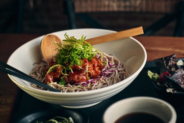 Lightly battered fried chicken, glazed with a spicy sweet and sour sauce. Served with a side of salad and bonito broth. Topped with scallions, togarashi and sesame seeds. Cold Soba.
