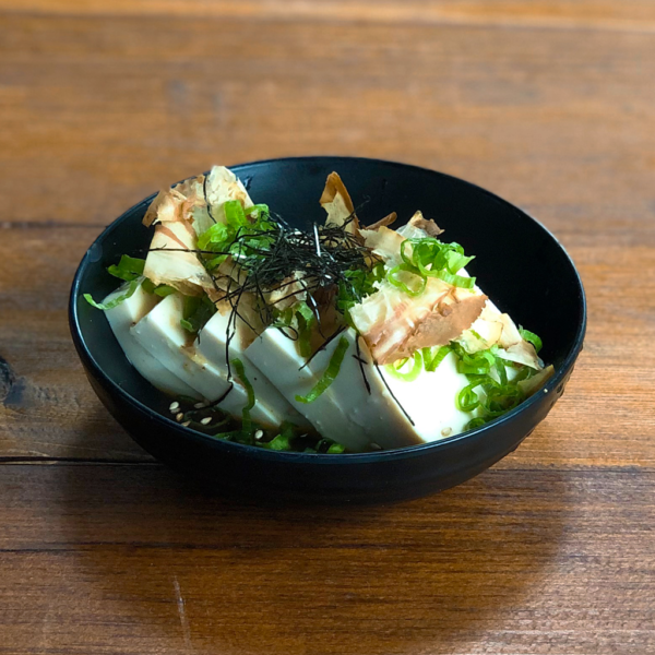 Tofu dressed with ginger, cold soba soup and soy sauce, topped with bonito flakes, green scallions and hari nori.