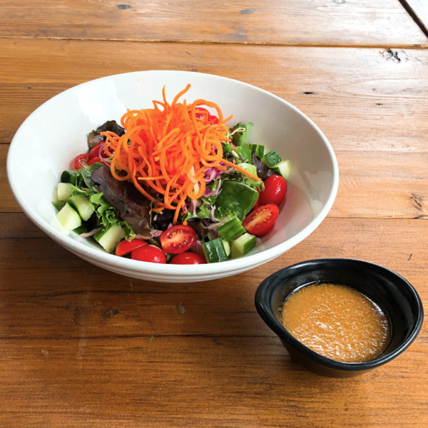 Cucumber, iceberg lettuce, carrot, plum tomato, and ginger carrot dressing.