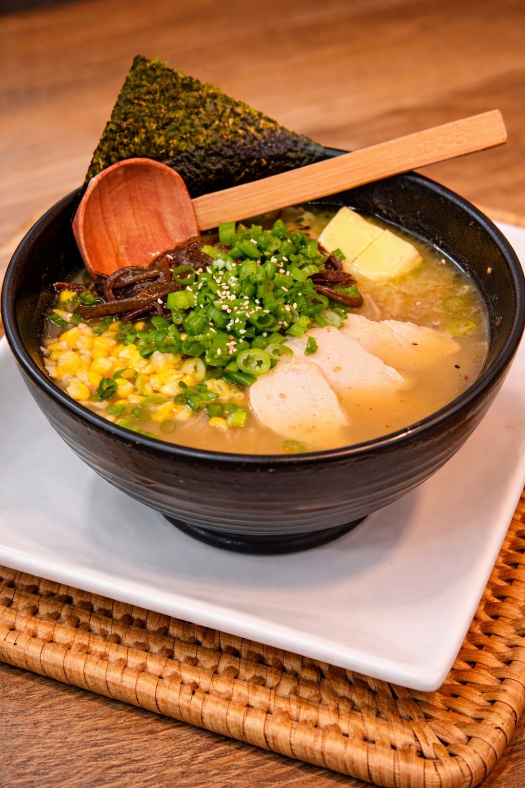 Creamy and rich, full flavor broth created from slow cooked pork bones. Served with chashu pork, pork seasoned boiled egg, and shishito peppers. Topped with shredded scallions, sesame seeds , and black garlic oil. Thin Noodles.