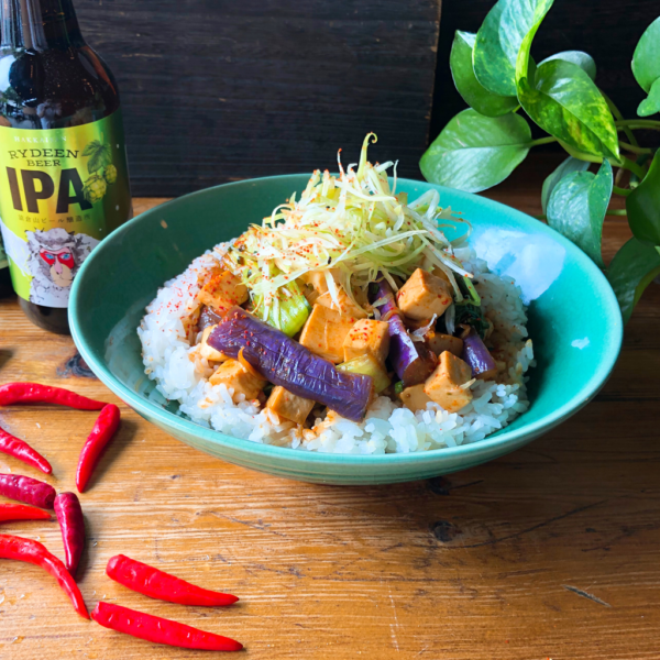 Tofu, eggplant, sauteed bok choy, and onions, sprinkled with togarashi and topped with green scallions.