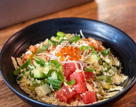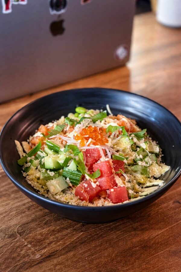 Cubed tuna, salmon, shrimp, avocado, cucumber, and edamame over sushi rice, topped with shredded egg and nori, drizzled with homemade yuzu aioli, and garnished with daikon and ikura. Zuke sauce on the side