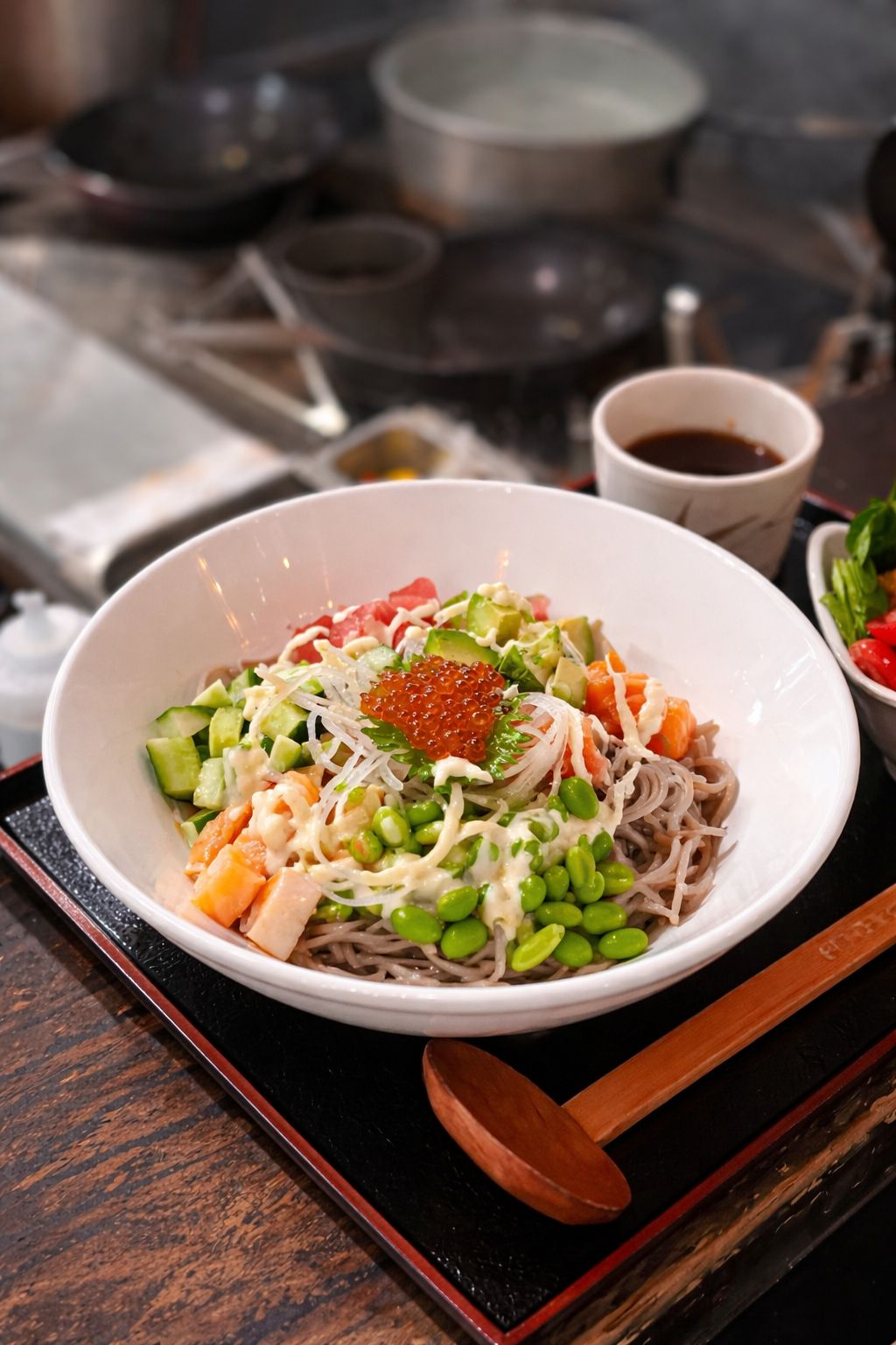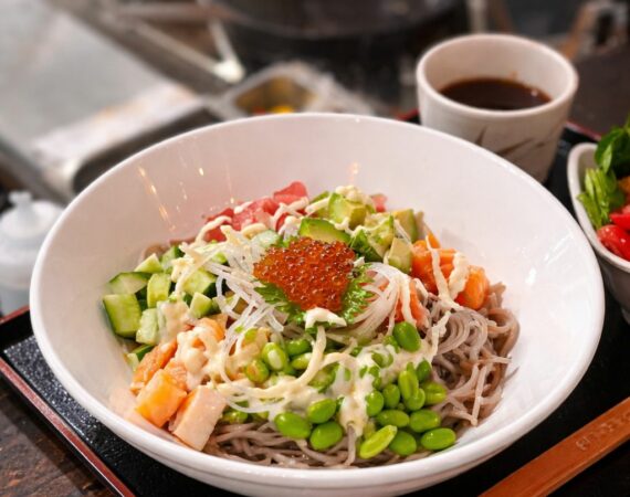 Cubed salmon, tuna, shrimp, ikura, edamame and cubed- cucumber. Topped with Daikon and Yuzu aoli.
