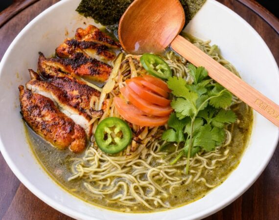 A flavorful blend of Latin and Japanese influences. Juicy saffron and togarashi-seasoned chicken thigh, sautéed onions, shiitake mushroom, and jalapeños come together in a rich tomatillo salsa verde chicken broth. Topped with fresh cilantro and nori. Bold, savory and tangy. Thin noodles