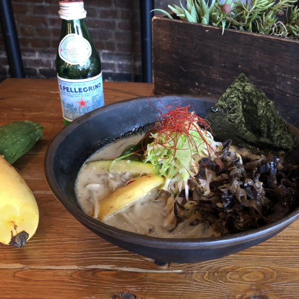 Served with sauteed zucchini, yellow squash, tofu, bean sprouts, kafir lime leaf, white scallions, sesame seeds, nori, kikurage mushroom and shredded red pepper. Curly noodles.